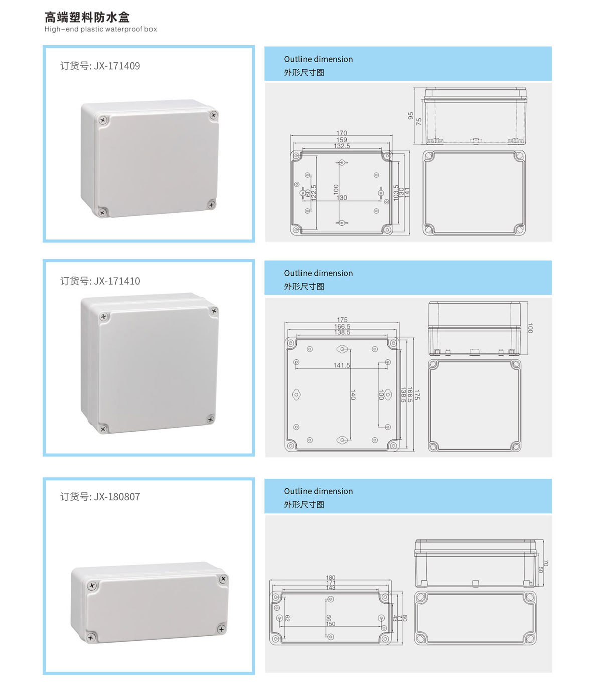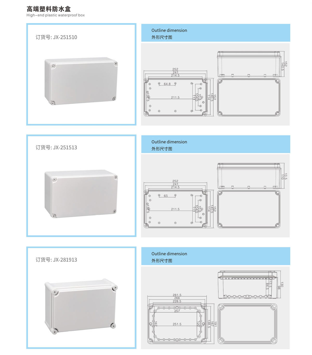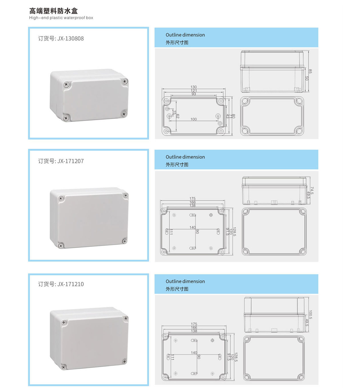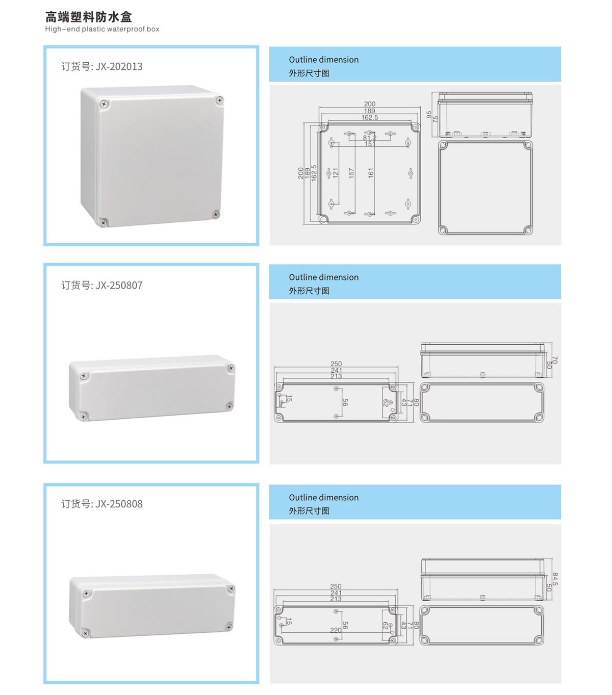 本公司专业生产高端塑料防水接线盒(防溅盒,密封盒,电气密封箱,防水监控电源箱,防水分线盒,防水端子盒等因地域不同,叫法不同,但功能一致为防水,防尘,防腐,绝缘,耐抗压)外型美观,防水等级P-67(水下一米)防抗压等级IK-08并通过ROHS,PAHS,以及多项外观设计专利。欢迎新老客户来电或实体店洽谈。
