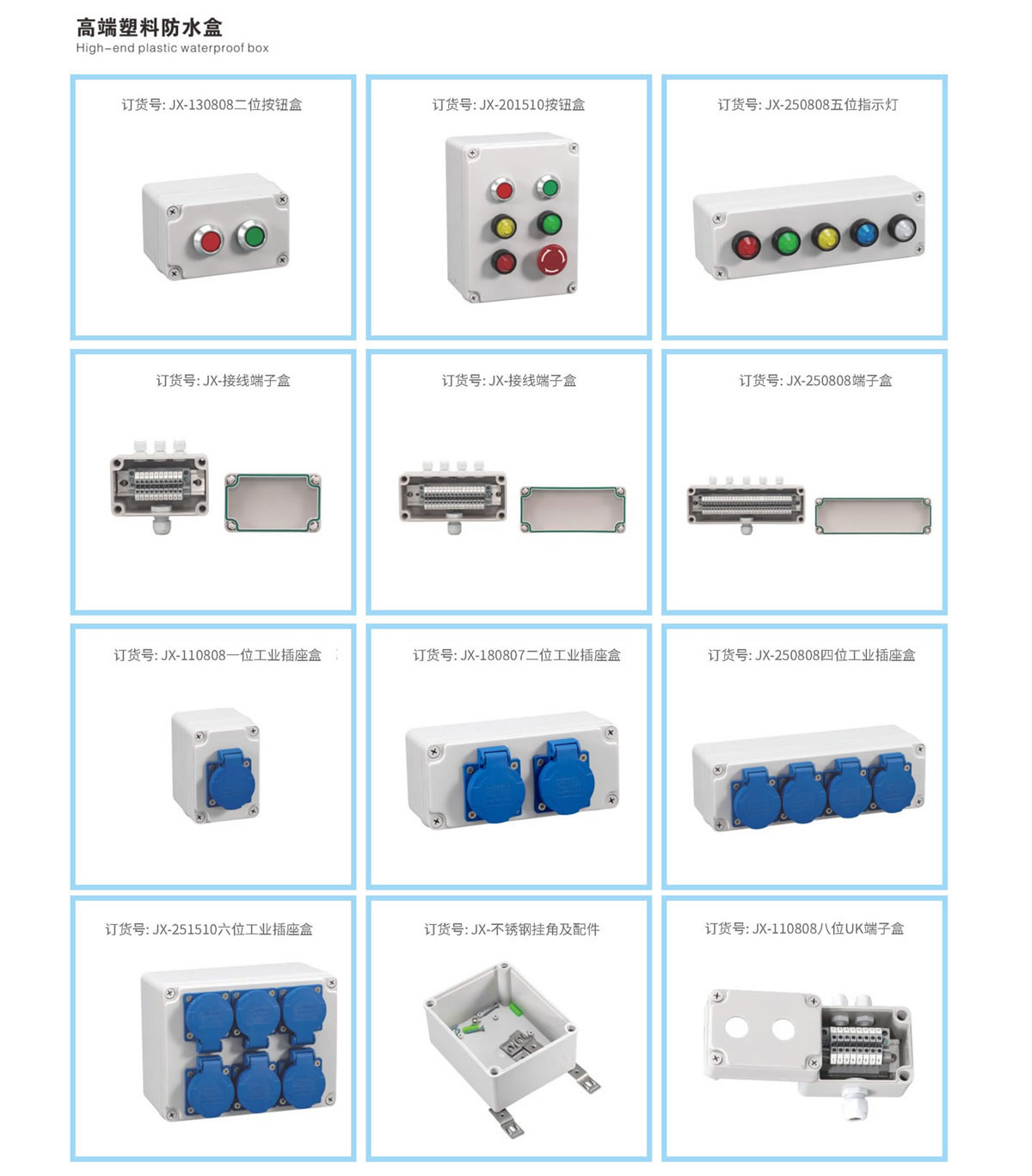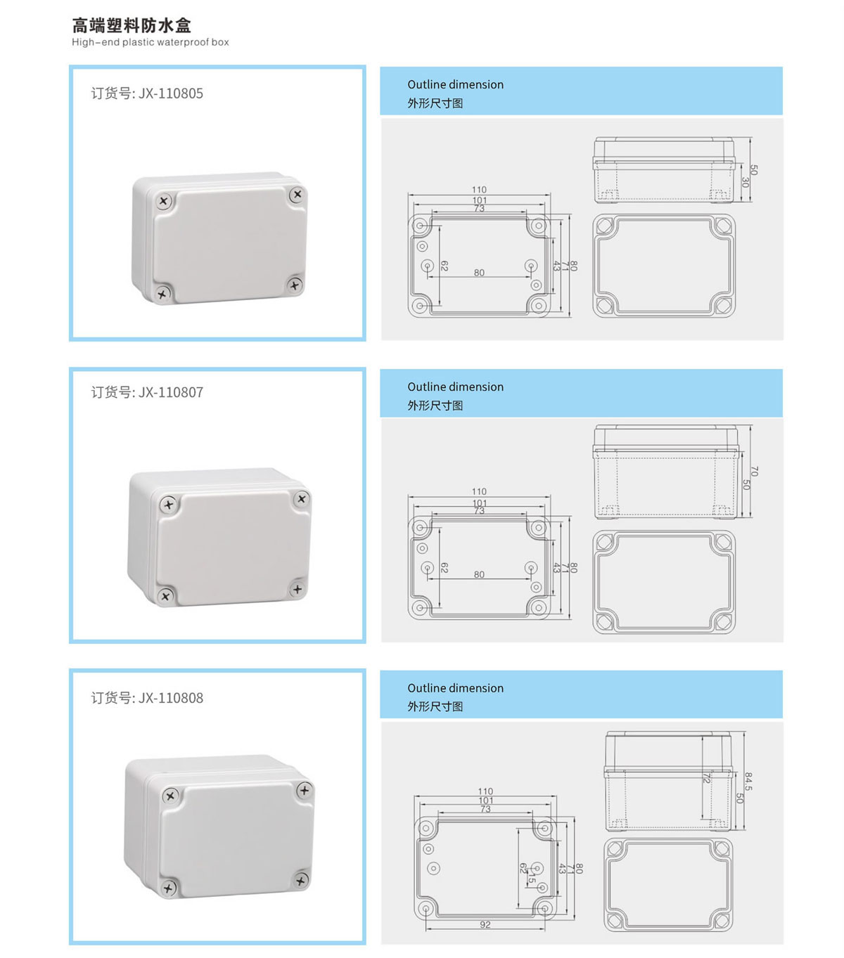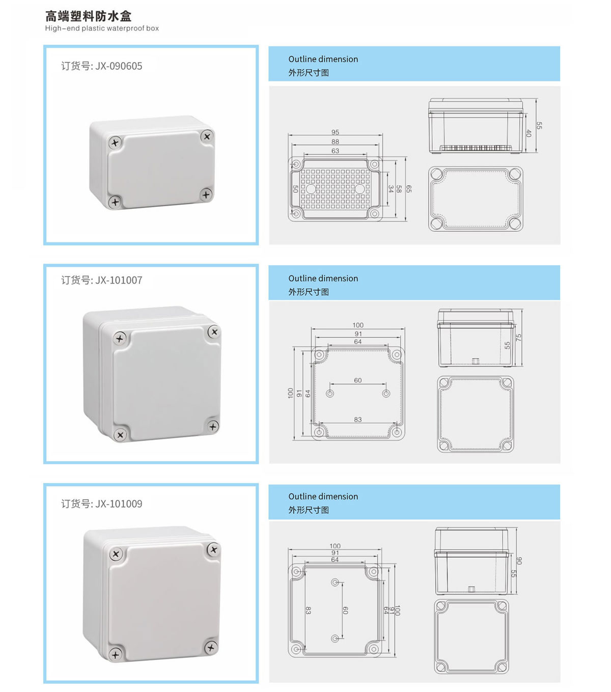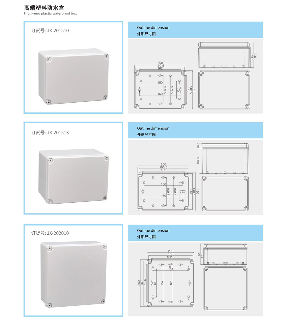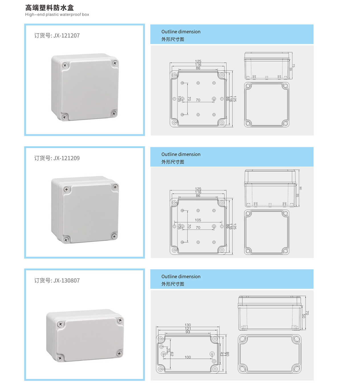 本公司专业生产高端塑料防水接线盒(防溅盒,密封盒,电气密封箱,防水监控电源箱,防水分线盒,防水端子盒等因地域不同,叫法不同,但功能一致为防水,防尘,防腐,绝缘,耐抗压)外型美观,防水等级P-67(水下一米)防抗压等级IK-08并通过ROHS,PAHS,以及多项外观设计专利。欢迎新老客户来电或实体店洽谈。